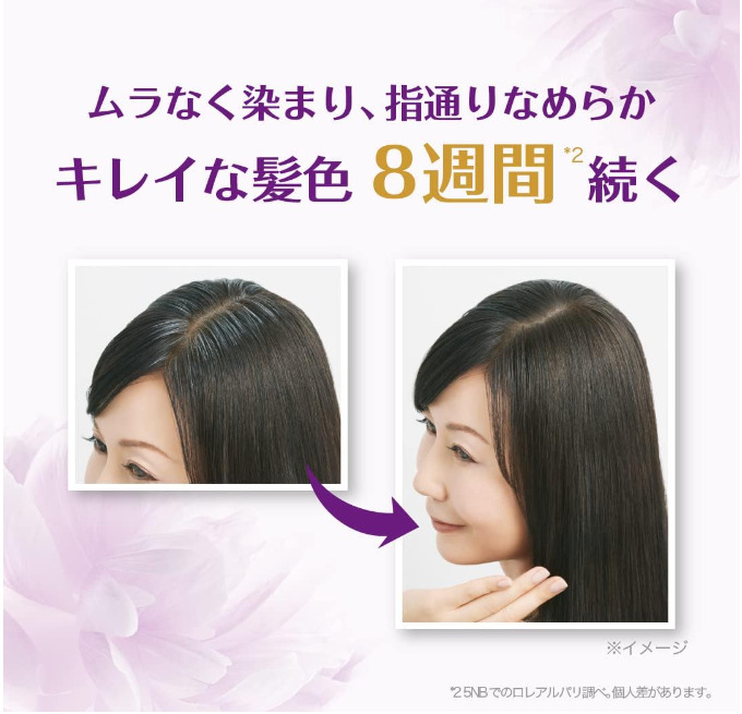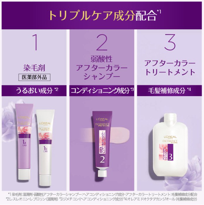 *5NBでのロレアルパリ調べ。個人差があります。*1染毛剤:湿潤剤・弱酸性アフターカラーシャンプー:ヘアコンディショニング成分・アフターカラートリートメント:毛髪補修成分配合