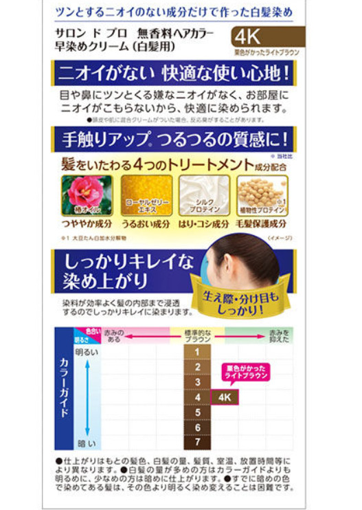 使い方も非常に簡単で、シャンプー後に髪に塗布し、5分〜10分ほど放置するだけで、誰でも手軽にプロフェッショナルな仕上がりが得られます。また、染料特有の強い匂いもなく、フローラルの香りで心地よい使用感が得られるのも魅力です。