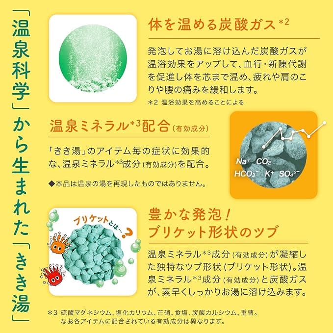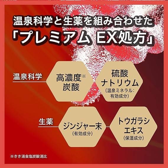 温泉成分(炭酸水素ナトリウム、硫酸ナトリウム)、保湿成分(チンピエキス、ヨモギエキス)