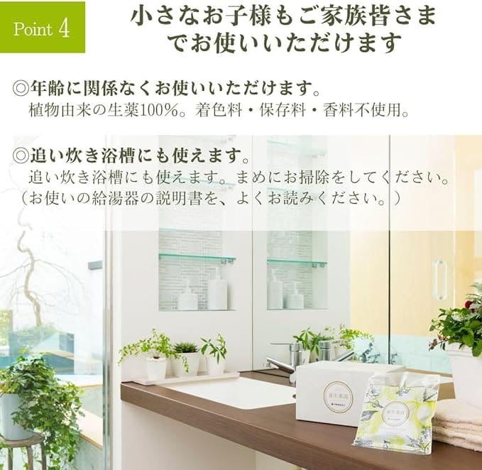 柑橘系と生薬の独特な香りが特徴で、これが温浴効果をさらに高め、血行を促進し、体を芯から温める助けをします。冷え症や肩こり、肌荒れ、リウマチなどでお悩みの方に特におすすめで、リラックス効果とともに、健康な体づくりをサポートするバスタイムを提供します。