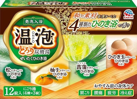 温泡 ONPO とろり炭酸湯 ぜいたくひのき浴は、温泉成分と炭酸ガスの絶妙な組み合わせによる入浴剤で、温浴効果を高め、血行を促進し、肩こり、腰痛、冷え症などの症状に効果的です。この入浴剤の特徴は、とろりとした湯ざわりとイオンのベールが体を優しく包み込み、湯上がり後のポカポカ感を長時間持続させる点にあります。さらに、松、菖蒲、柚子、ひのき玉の和の素材をイメージした4種類のひのき浴の香りが楽しめ、長野県の「木曽ひのき」から抽出したオイルが香りの深みを加えます。アレルギーテスト済みで、安心して使用できる配慮も施されています。
