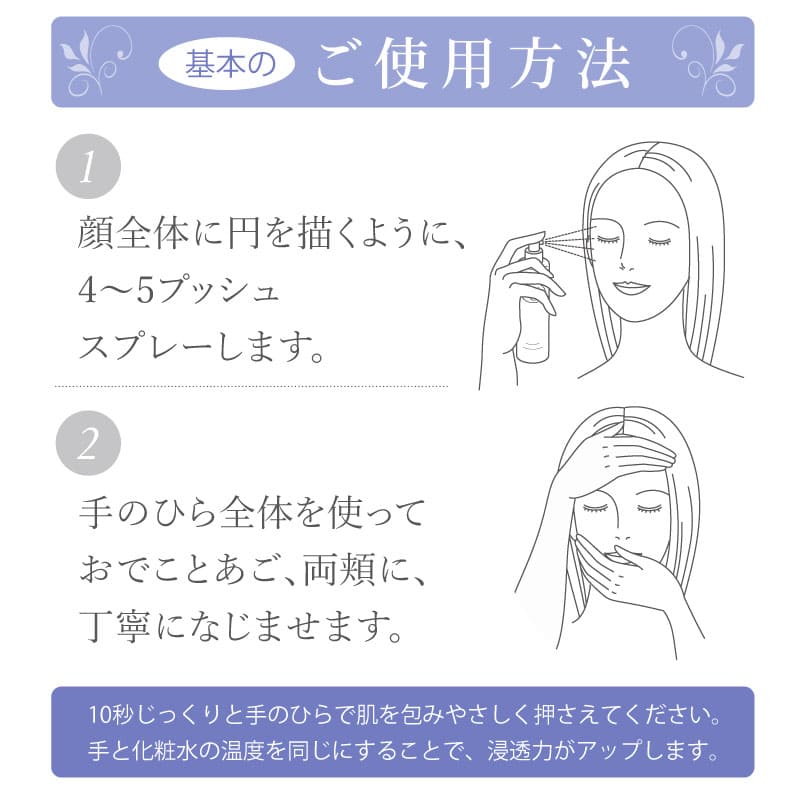 つぎに、手のひらで包み込むように顔全体へ広げます。ここで乾燥が気になる場合は、気になる部分に2度付けしましょう。