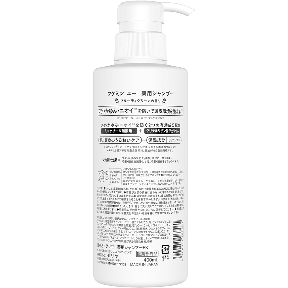 ダリヤ フケミンユー 薬用シャンプーは、2つの有効成分を配合した薬用シャンプーです。その成分とはミコナゾール硝酸塩とグリチルリチン酸ジカリウムの2つの有効成分がフケ・かゆみ・ニオイを防ぐ効果が期待できます。特徴としては、キメ細かい泡立ちで髪と頭皮をやさしく包み込んで洗い上げ、すっきり・さらさらな仕上がりで、快適な洗い心地が挙げられます。