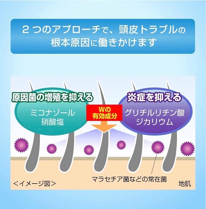 フケ・カユミを除き、皮脂・汚れも除く、抗炎症成分(グリチルリチン酸ジカリウム)が頭皮の炎症を抑えます