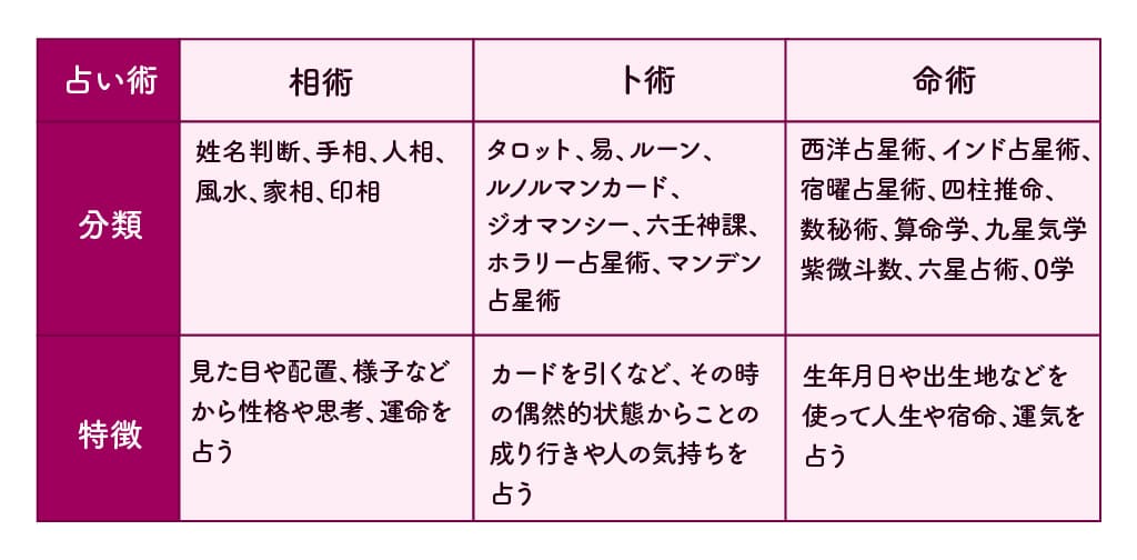 占術は、「相術」「卜術」「命術」のいずれかに分類され、それぞれ以下のような特徴があります。