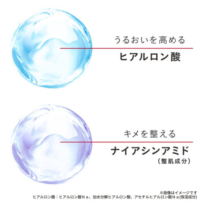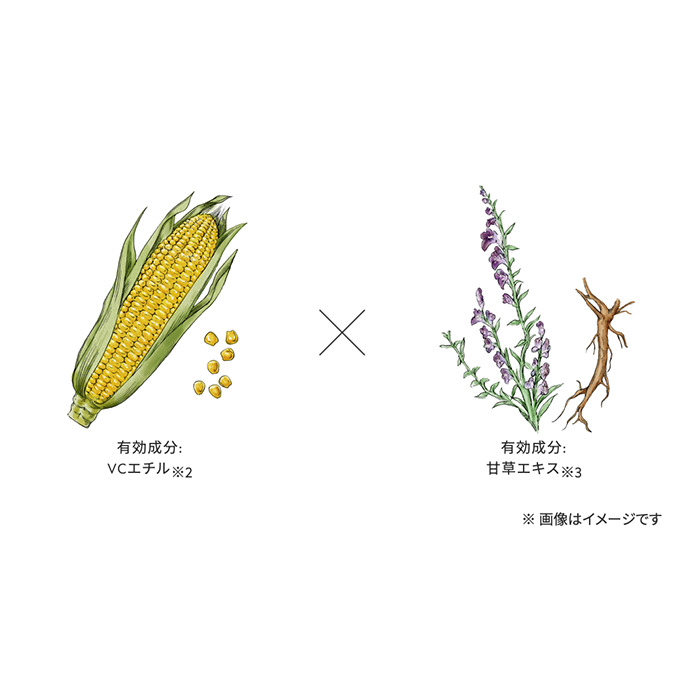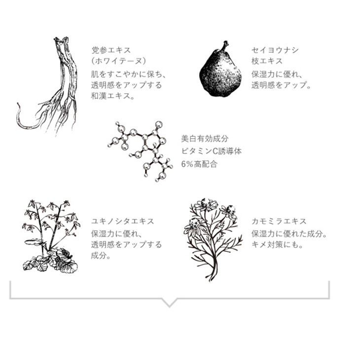 また、ブライトVCコンプレックスという独自の複合成分が、乾燥による透明感の原因にアプローチ、保湿しつつクリアな肌へ導きます。速効性保湿成分の「ヒアルロン酸ナトリウム」や持続性保湿成分「ソルビトール発酵多糖液」も配合されており、またグリチルリチン酸ジカリウムにより肌荒れを予防しながらうるおいで満たされたみずみずしい肌へ導きます。