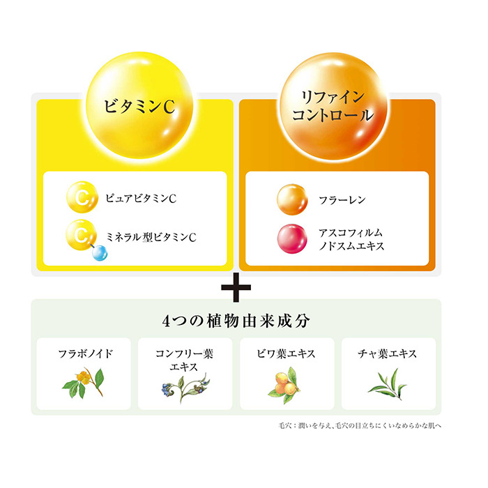 他にも保湿成分「グルタチオン」や抗酸化成分「ナイアシンアミド」を配合して、つやのあるハリ肌を目指します。8種の植物エキスにより、毛穴の目立たない肌に導きます。