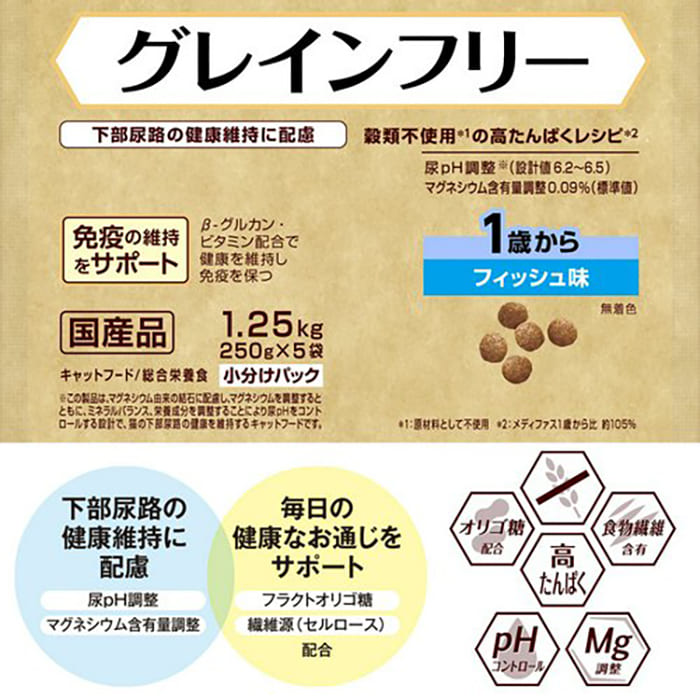 メディファスアドバンスキャットフードグレインフリーは、下部尿路の健康維持を考えたキャットフードです。猫の体調の悩みのなかでも特に気になる下部尿路の疾患に対して、尿のphコントロールしやすい設計値を定めて対応。そのため、健康維持のために腎臓が心配なシニア猫も酸性化の心配がなくなります。また、フラクトオリゴ糖とセルロースを配合して善玉菌を増やすことで腸内フローラが整い、便通にも効果が期待できます。さらに、日本の猫が大好きなフィッシュ味なので、食いつきの良さにも定評があります。