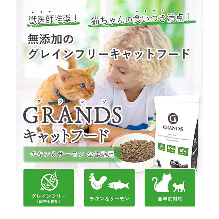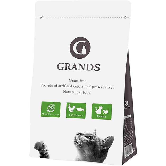 GRANDS(グランツ)チキン&サーモンは、糖質をおさえた高タンパク質のキャットフードです。愛猫がいつまでも健康に食べ続けられるように、糖質は23%以下におさえており、肥満予防に効果的です。また、人工添加物不使用のレシピを実現しているため、安心して愛猫に与え続けられます。さらに、1袋500gの小袋同時に複数味を開封してローテーションをしても美味しい状態で食べきっていただけます。味も選べる「サーモン」「チキン&サーモン」「チキン」の3種類。特にチキン&サーモンは、チキンとサーモンが71.8%も配合された高たんぱくでおすすめです。