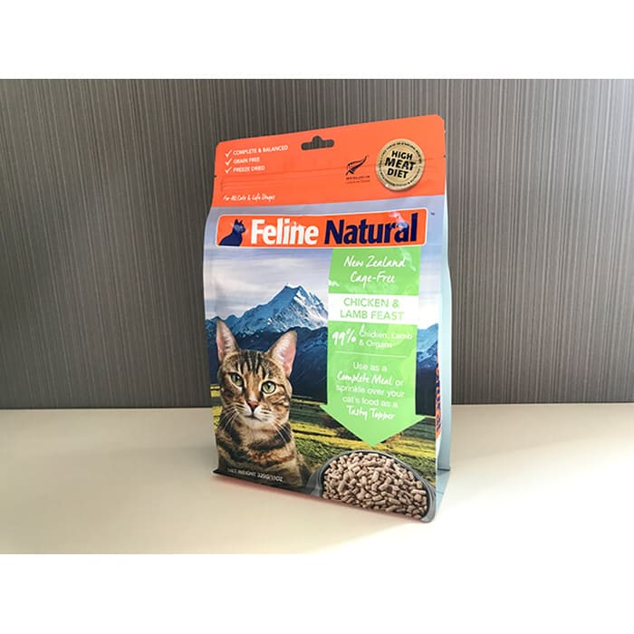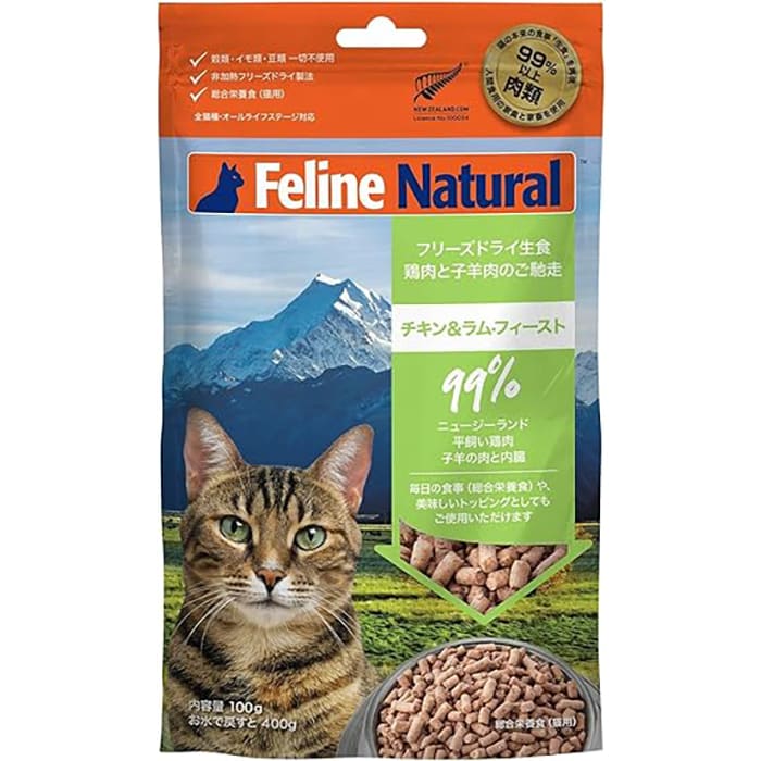 FelineNatural(フィーラインナチュラル) チキン&ラムは、高タンパク質でヘルシーなキャットフードです。ヘルシーなラム肉と鶏肉をバランス良く配合した肉類の割合は99%以上で高タンパク。また、ラム肉は、脂肪燃焼を促進するL-カルニチンを多く含んでおり、肥満予防に役立ちます。さらに、鶏肉はタンパク質の吸収効率が良いため食べやすさにも配慮しています。その他の特徴として、特殊のフリーズドライ製法を採用。素材の栄養素や風味を逃がすことなくそのまま提供することを実現しています。そのため、子猫からシニア猫まで安心して食べ続けることが可能です。