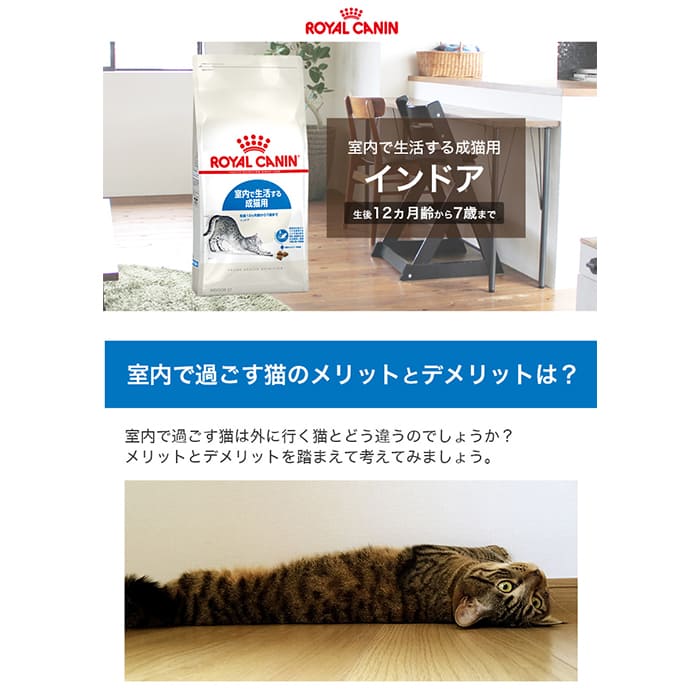 ロイヤルカナン インドアは、室内で生活する猫専用のキャットフードです。インドアで生活する猫は運動不足で太りやすくなったり、腸の活動が鈍くなったりする傾向があります。そのため、カロリー含有量を適切に調整して、健康的な消化の維持に貢献します。