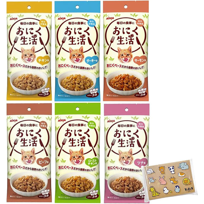 アイシア|おにく生活は、お肉のおいしさがたっぷり詰まった小袋タイプの食べやすいキャットフードです。お肉のうまみをゼリーでしっかり包みこんだお肉ベースで提供しています。また、お肉のラインナップも豊富に揃えているため、好みの味が選べます。さらに、一袋が60gの小袋になるため、食べ残しの心配がありません。その他、袋に二ヶ所の切れるところがあるのも便利で助かりますね。お肉が好きな愛猫はもちろん、魚が好きな猫でも「このシリーズのお肉なら食べられた」と言う口コミも多く挙がるほどの食べやすさです。