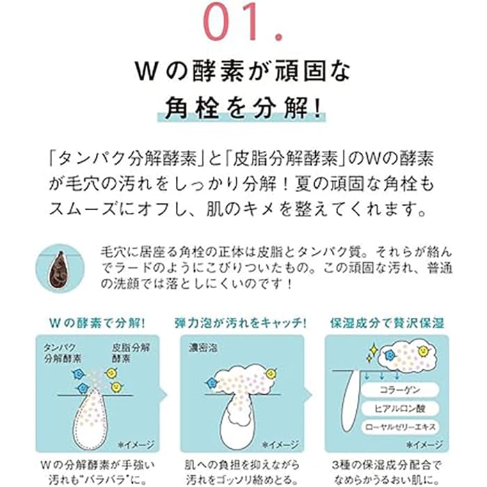ハチミツ発酵液などのマイルドピーリング剤をはじめとし、保湿成分にはホホバ種子油やコメ発酵液、コラーゲン発酵液エキス、ターンオーバーサポートにはブドウ果汁発酵液や乳酸桿菌など、敏感肌にもおすすめのうるおいとやさしさにこだわった処方になっており、石油系合成界面活性剤、パラベン(防腐剤)を含む旧表示指定成分、合成香料、合成着色料、鉱物油、タール色素不使用のフリー処方となっています。また、海洋深層水を配合することで肌にうるおいを与え、浸透を促進する効果が期待できるので、泡パックやクレンジング後の酵素洗顔としてもおすすめです。