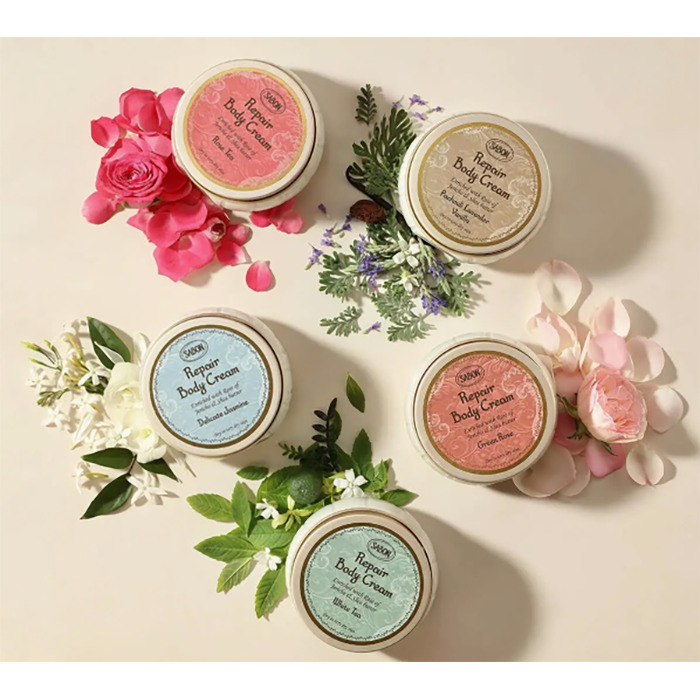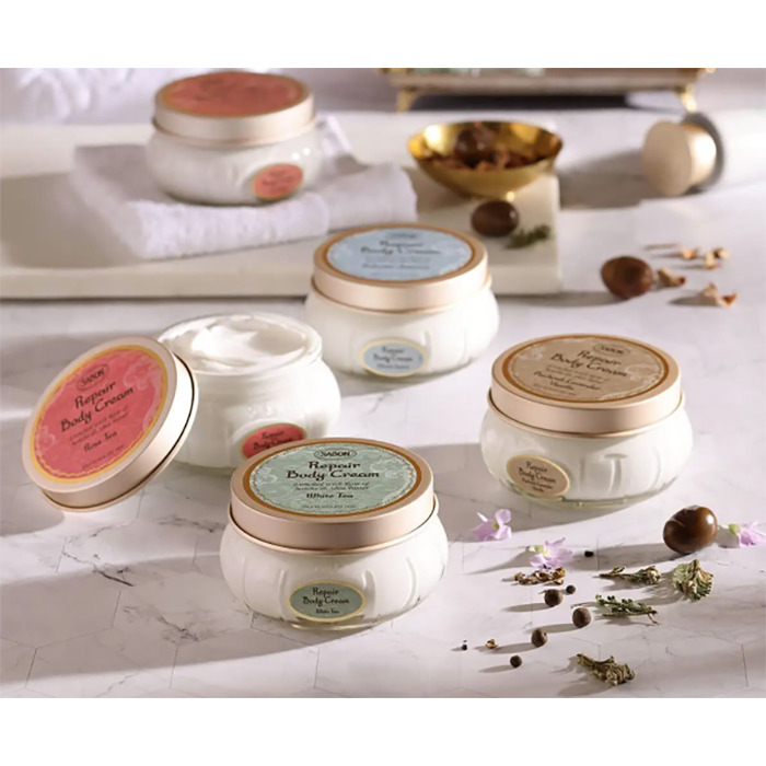 SABON「リペアボディクリーム」のシリーズは、ホワイトティーやグリーン・ローズをはじめ全6種類の香りがあり、自身の好みに合わせて購入可能です。保湿成分である「アンザンシュエキス」や「シア脂(エモリエント)」が配合されており、乾燥ダメージを集中ケアします。パッケージはジャータイプで、高級感あるデザインなのでプレゼントにもおすすめです。