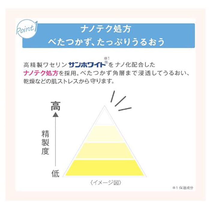 SANA ワセリズム 保湿化粧水は、保湿成分の高精製ワセリン「サンホワイト」をナノ化して配合した化粧水です。ナノ化させたことで、肌表面のバリアとしてうるおいを保つだけでなく、角層まで保湿成分が浸透し、水分補給を行ってくれます。また、肌が喜ぶ保湿成分として3種のセラミドとヒアルロン酸Naもプラスされています。使うたびにうるおいを補ってくれるので、気持ちよく使用し続けることができるでしょう。