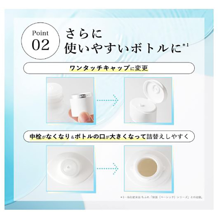 ちふれ 保湿化粧水は、水分を「蓄える・抱え込む・閉じ込める」という肌のうるおいメカニズムと同じ要素を採用した化粧水です。肌のうるおいメカニズムと同じ要素にすることで、保湿力がアップして肌なじみの良くなり、気持ちの良いうるおい肌が持続します。使用しやすいようにワンタッチキャップへ変更したり、中栓をなくしてボトルの口を大きくしたりした点もおすすめするポイントです。詰替え用も販売されているので、価格を抑えながら使用し続けたい方にもピッタリでしょう。