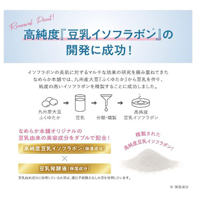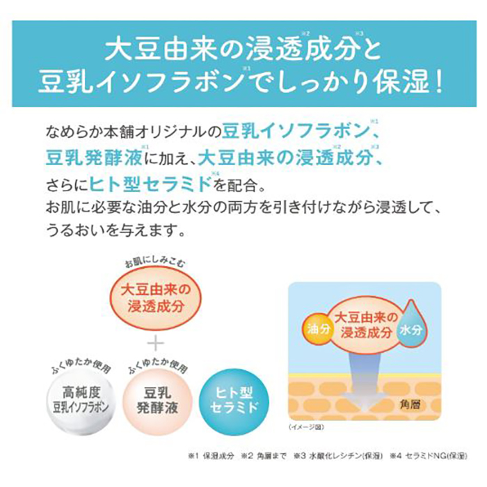 なめらか本舗 マイクロミスト化粧水 NCは、毛穴より細かいマイクロミストタイプの化粧水です。なめらか本舗オリジナルの「高純度豆乳イソフラボン」と「豆乳発酵液」のW豆乳由来成分に加え、整肌成分としてヒト型セラミドを配合しています。これら3つの成分により、肌に必要な油分と水分の両方を引き付けながら浸透して、うるおいを与えます。