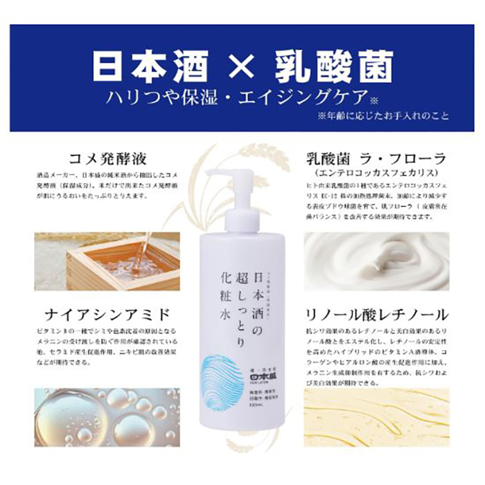 日本盛 日本酒の保湿化粧水 しっとりは、肌にうるおいを与えて整える日本酒を配合した化粧水です。ポンプ付きのボトルにリニューアルしたことで使いやすさがアップしました。しっとりもちもち肌に導く乳酸菌をはじめ、保湿成分として、ナイアシンアミド・レチノール誘導体・ ヒアルロン酸・ コラーゲン・セラミドなどもたっぷりと配合しています。超しっとりであるにもかかわらず、使い心地はさっぱりとしているため、「ベタつきが気になる」という人も気持ちよく使用できるでしょう。