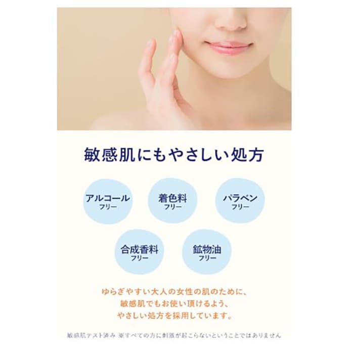 また、アルコール、鉱物油、着色料、合成香料、パラベン、石油系界面活性剤の6つの成分が無添加のため、敏感肌※2 の方にもおすすめです。