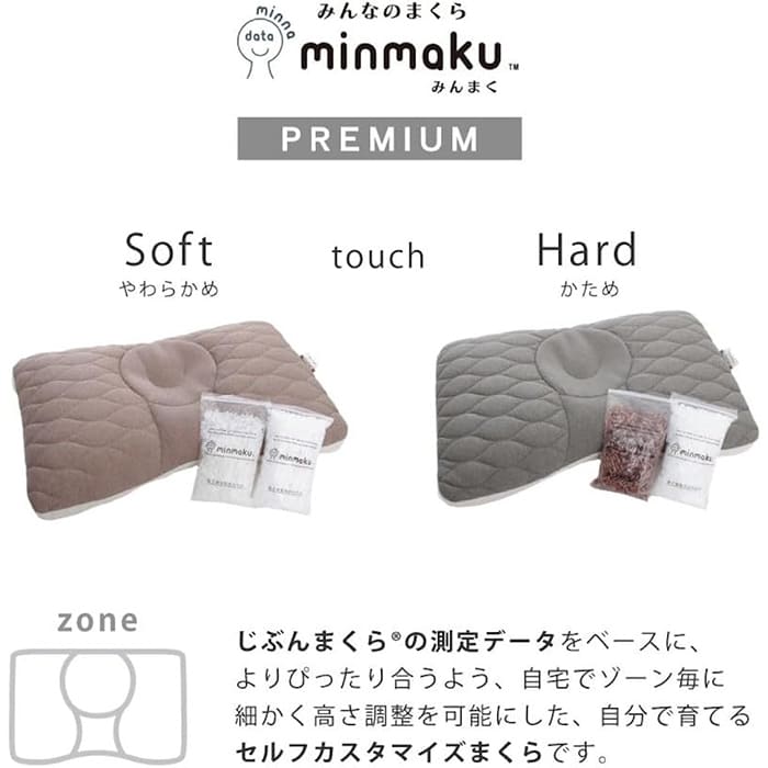 タナカふとんサービスの人気シリーズである「みんまく(みんなのまくら)」の一つが、みんまくグランプレミアムです。自分で好きな高さ・形状をカスタマイズできるように、自分で高さ調整ができる仕組みになっています。オーダーメイドの枕と同じような自分だけの枕を作り出すことが可能です。