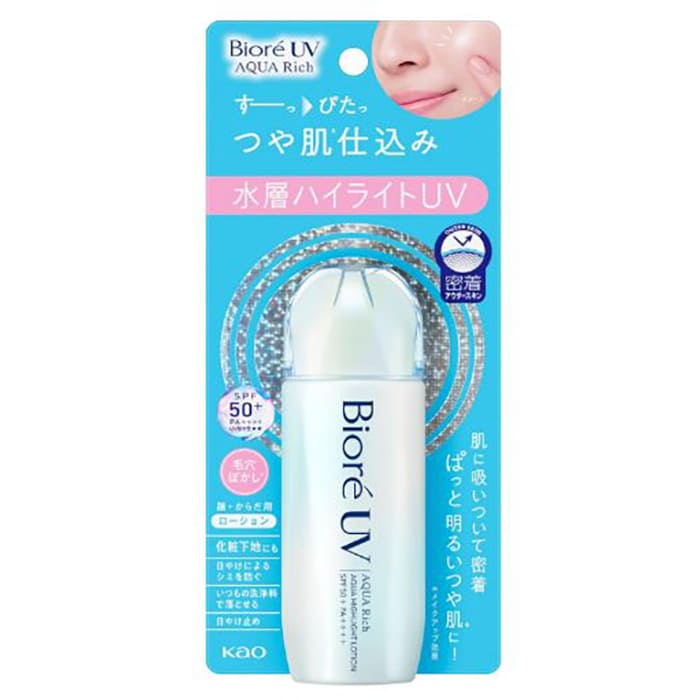 花王【ビオレUV】 アクアリッチ アクアハイライトローションは、いつもの洗顔料で落とせる大容量の日焼け止めクリームです。ツヤを生み出す「水光パール」とUVカット成分を含んだ「アクアカプセル」の2層構造でピタッと密着し、明るいツヤ肌へと導きます。