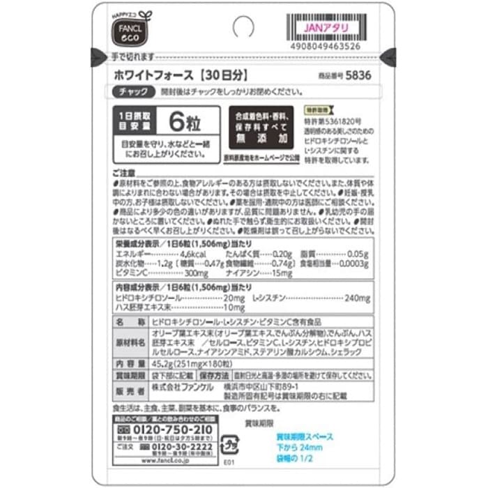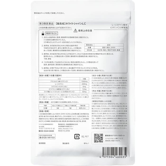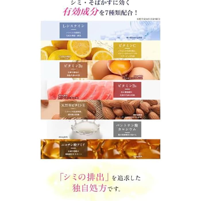 4種類のビタミンと、体内では作ることのできないL-システインを配合。L-システインは、シミの原因となるメラニンの生成を抑制し、紫外線のダメージを軽減してくれます。また、メラニンの色素を無色化する有効成分がシミ・そばかすにアプローチするので、顔や手だけでなく、全身のシミをケアします。