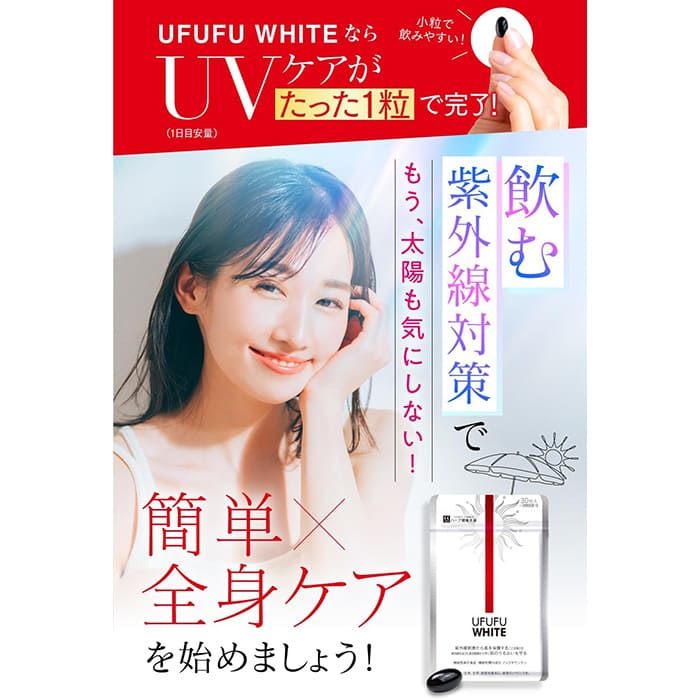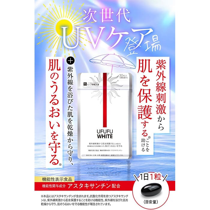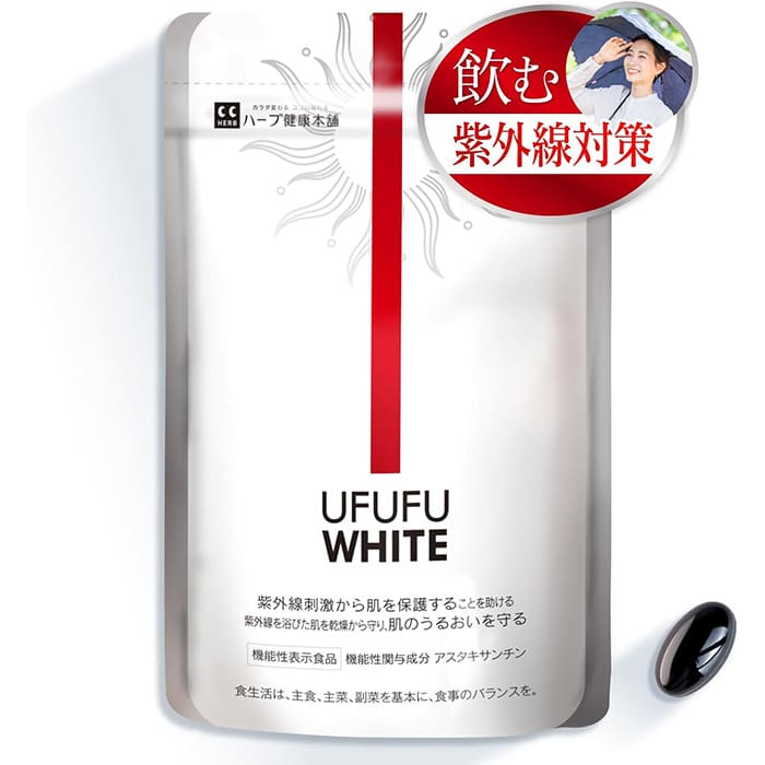 ハーブ健康本舗のウフフホワイトは、1粒で紫外線対策のできる日焼け止めサプリ。小粒で飲みやすいので、ストレスなく継続して使用することができます。