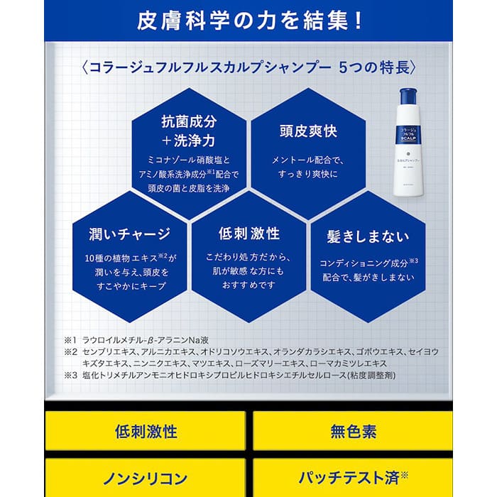 コラージュフルフルスカルプシャンプーは、過剰に分泌された皮脂を洗浄してフケの原因を除去するシャンプーです。
