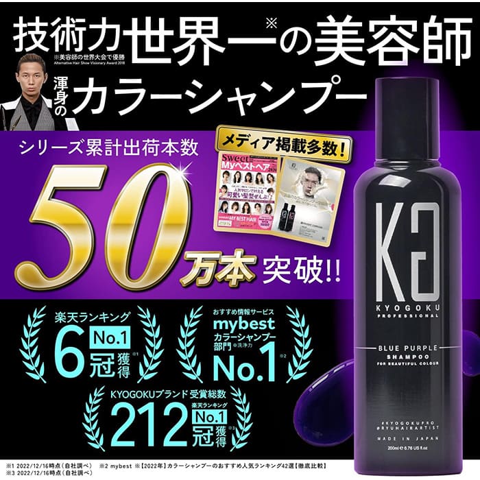 KYOGOKUのブルーパープルカラーシャンプーは、数々のコンテストで受賞した美容師『京極琉』が開発した、プロクオリティの紫シャンプー。「髪から人生を彩り、豊かにしたい」という想いで、ユーザーの期待に応えたシリーズ展開を行っています。