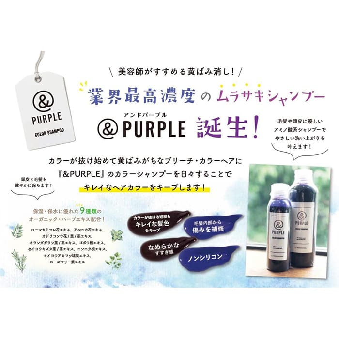 &PURPLEのムラサキシャンプーは、9種類のオーガニック・ハーブエキスの配合で保湿性にこだわった紫シャンプー。ヘアサロンを展開するPRIZEの専売品で、プロクオリティの安心できる商品です。