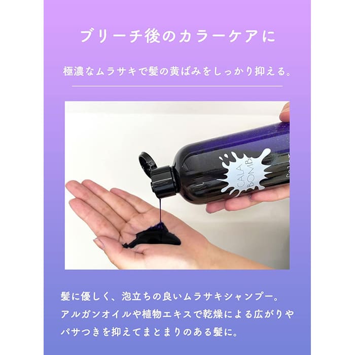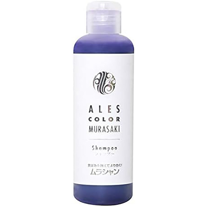 アレスカラーのムラサキシャンプーは、洗いあがりのきしみを抑えながらカラーを持続させる紫シャンプー。白系やアッシュ系のカラーの持続に最適の商品です。