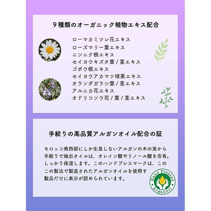 成分は、保湿・保水に優れた9種類のオーガニック・ハーブエキスを配合。髪に優しく、頭皮と毛髪を健やかに保ってくれます。使い続けることで指通りの良い滑らかな髪質へと導いてくれる商品です。