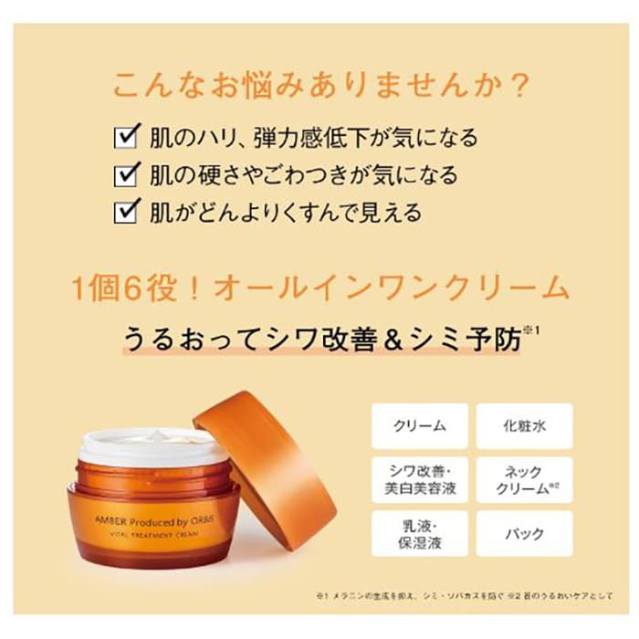 【ORBIS】アンバー ヴァイタルトリートメントクリームは、大人世代の悩みに応えてくれるマルチなオールインワン美容液です。Wナイアシンによるシワ改善・美白に加え、肌にうるおいとハリを与える複合成分も配合し、うるおいをぎゅっと閉じ込めます。テクスチャは肌になじみやすく、ほどよい保護感を感じながら、じゅわっとうるおいが広がるこだわり仕様です。しっとりとやわらかさを体感できる、なめらか肌に導きます。