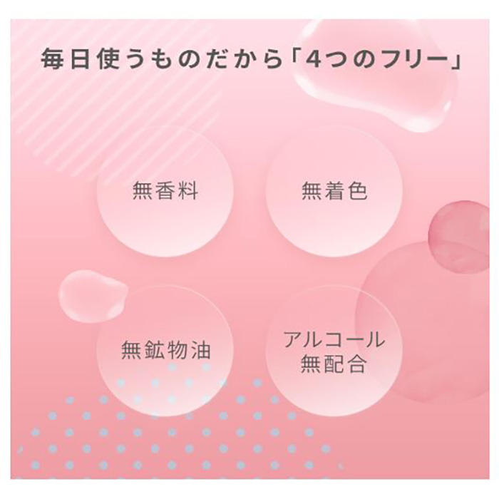 こだわりの低刺激性処方で、無香料・無着色、弱酸性、アルコール(エチルアルコール)無添加、パラベンフリー、紫外線吸収剤フリーであり、アレルギーテストやパッチテストなどの各種テストの実施済です。