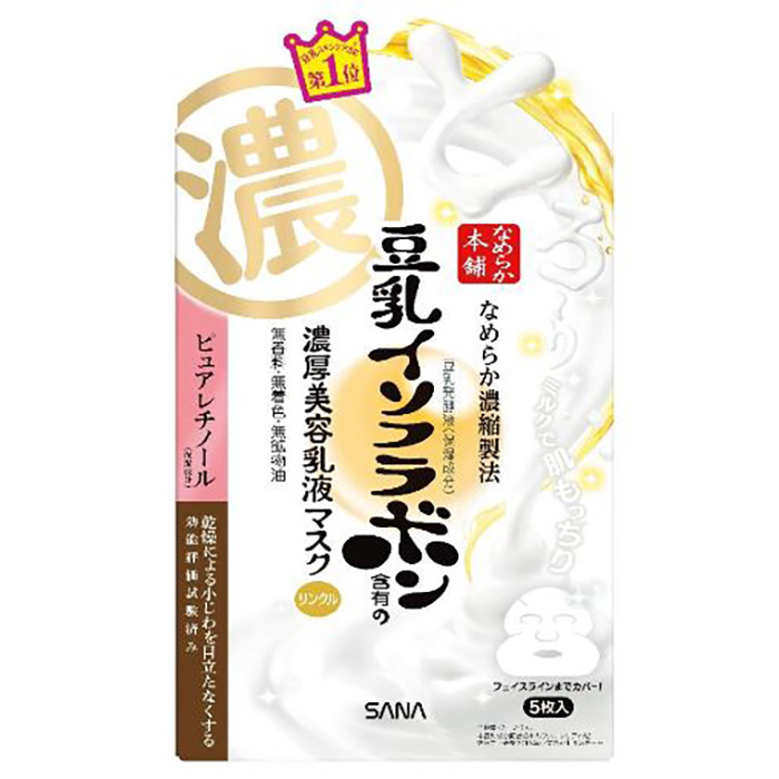 常磐薬品工業【SANA なめらか本舗】リンクルジェル乳液マスクは、なめらか本舗オリジナルの豆乳発酵液に加え、ピュアレチノールを配合した最高保湿のエイジングケアシートマスクです。なめらかでコクのあるジェル乳液が肌にたっぷりのうるおいを与えます。また、1枚で化粧水・美容液・乳液・クリーム・パックの5役をこなしてくれるため、スキンケアに時間をかけられないという忙しい方にもピッタリです。