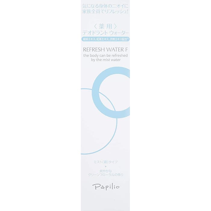 パピリオのリフレッシュウォーター Fは、様々なシーンで使える薬用デオドラントウォーター。家族全員で、全身のすみずみまで使用することができます。細かい霧状なので肌を傷める心配もありません。