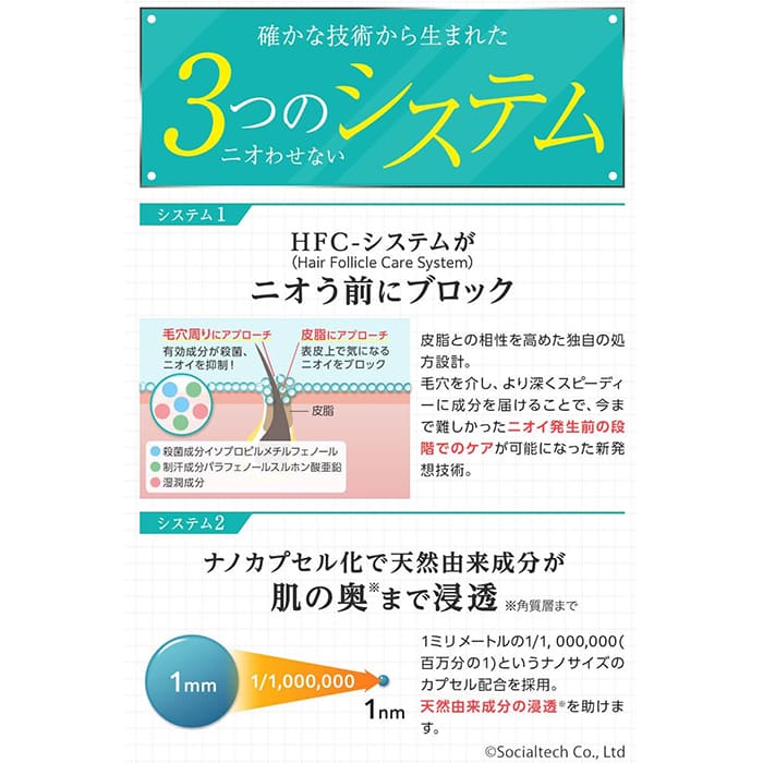 皮脂との相性を高めた独自のHFCシステムを採用。殺菌成分と制汗成分を独自の割合で配合し、皮脂や毛穴周りにアプローチして臭いが発生する前にケアしてくれます。