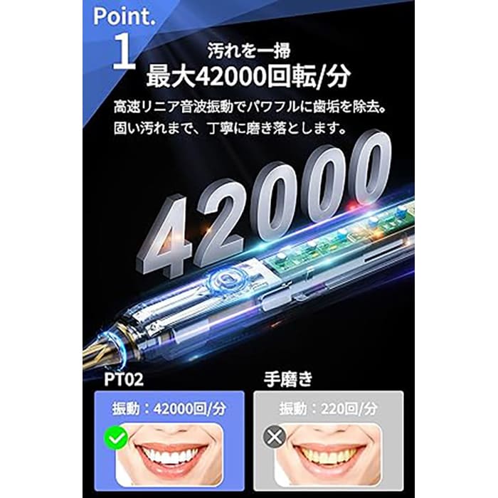 1.高い歯垢除去力: 電動歯ブラシは、毎分数千から数万回という高速な振動や回転で歯を磨くため、手磨き歯ブラシでは落としにくい歯垢や汚れを効果的に除去します。これにより、口腔内を清潔に保ち、歯の健康を守ります。