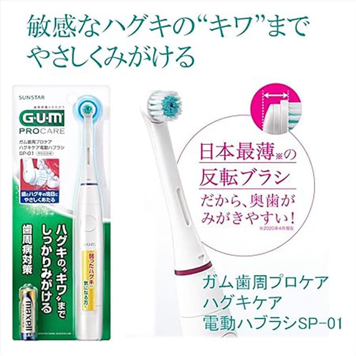 GUM歯周プロケアハグキケア電動ハブラシ SP-01は、歯茎の健康を特に重視して設計された電動歯ブラシです。高速振動と特別設計のブラシヘッドにより、歯と歯茎の間にたまった歯垢を効果的に除去します。