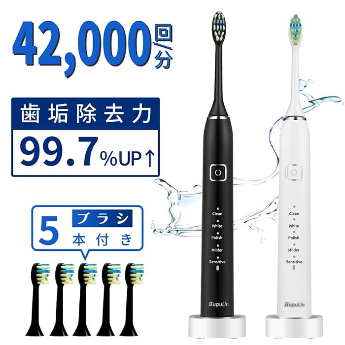 Supulin 電動歯ブラシは、1分間に最大42000回の高速音波振動で、歯垢を効果的に除去する音波式電動歯ブラシです。クリーン、ホワイト、研磨、ソフト、敏感、の5つのモードを搭載。歯の状態に合わせて選ぶことができます。