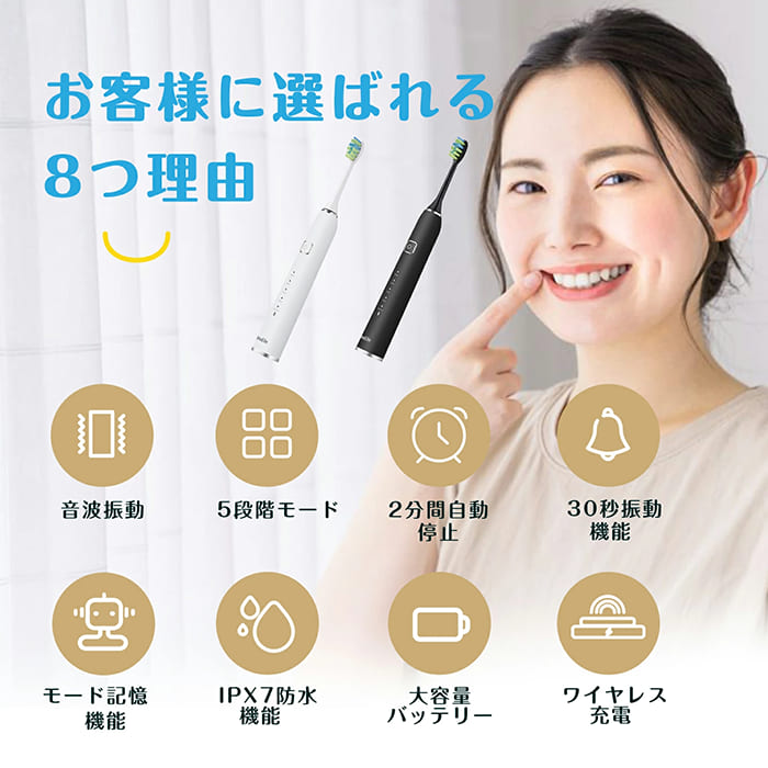 音波式電動歯ブラシは、近年人気が高まっている電動歯ブラシで、高速で振動するブラシヘッドを利用して、歯と歯茎を効果的に清掃します。このタイプの電動歯ブラシは、毎分数万回の振動で歯垢を効果的に浮かせて落とすため、手磨きよりも効率的に歯を磨くことができます。