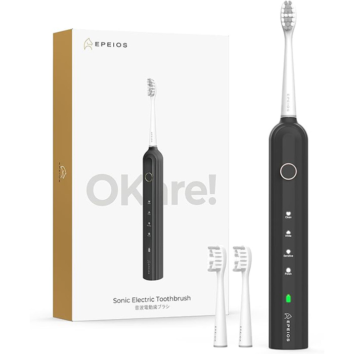 Epeiosの電動歯ブラシは、コストパフォーマンスに優れた音波電動歯ブラシです。毎分32,000回の高速振動で効果的に歯垢を除去し、クリーン、ホワイト、センシティブ、ポリッシュの4つのブラッシングモードを備えています。また、2分間スマートタイマー、加圧防止センサー機能もついています。