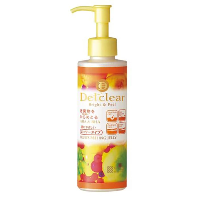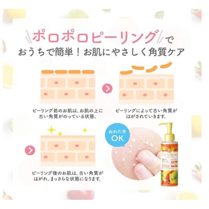 DETクリア ブライト&ピール ピーリングジェリーは、余分な角質を浮き上がらせる果実AHAと、角質をやわらかくする植物BHAをW配合しているピーリングジェルです。合成着色料・鉱物油・アルコールなど肌への刺激成分を配合していないため、肌に優しいピーリングが行えます。もちろん、濡れた手でもOKです。