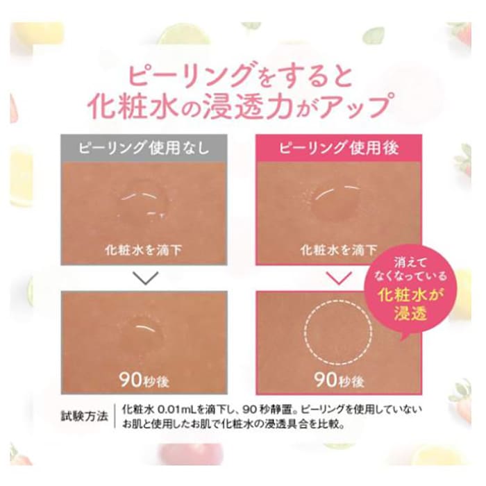 顔だけでなく、ひじやひざ、かかとなどの全身ケアにも使用できるため、気になる箇所で使用してみましょう。化粧水や美容液などの浸透力もアップし、肌の透明感も高めてくれるため、くすみが気になる方にもピッタリの商品です。フレッシュなミックスフルーツの香りは、上向きな気分へと変えてくれるでしょう。