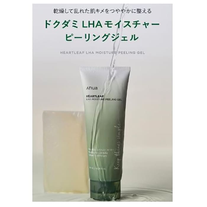 【ANUA】ドクダミLHAモイスチャーピーリングジェルは、ドクダミの水分感が感じられる、みずみずしいテクスチャが特徴のピーリングジェルです。角質ケアが叶うLHA成分が溜まった角質を優しく軟化させ、ナチュラルセルロースが様ざまな大きさの角質をキャッチします。その後、古い角質が除去された肌を、ドクダミが優しく健やかに整える、というのがこの商品の仕組みです。