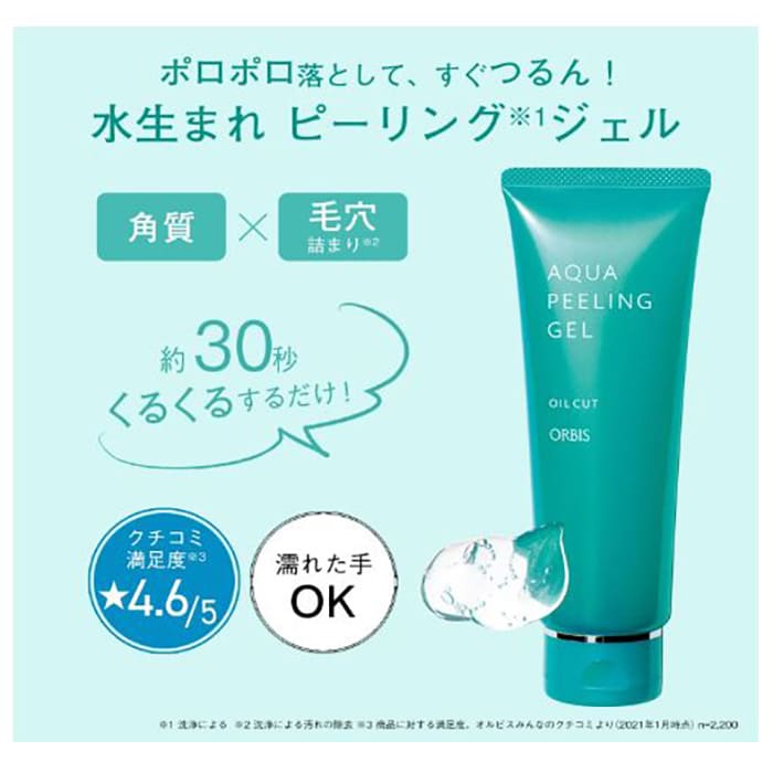 【ORBIS】 アクアピーリングジェルは、海洋深層水配合の水ベースとアンズ果汁で、角質を自然にはがれやすく、浮かせてから取り除いてくれるピーリングジェルです。水を利用して取り除く仕組みなので、強い酸を使った科学的なピーリングやゴシゴシ擦る方法と異なり、必要以上に角質を取りすぎる心配がありません。そのため、「ピーリングは初めて」「刺激が心配」という方にもおすすめです。
