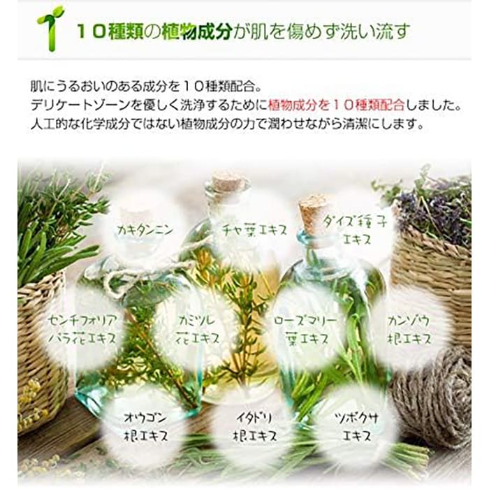肌へのやさしさを考えた処方も特徴のひとつ。10種類のフリー処方・99%の天然成分・弱酸性と、デリケートゾーンへの負担を抑えた設計なので、肌が敏感な人でも使いやすい商品です。