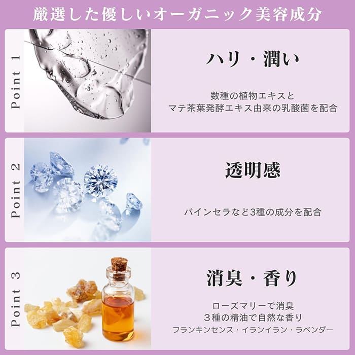 香りは、美容の効果もある3種類の精油を採用。イランイラン・ラベンダー・フランキンセンスのナチュラルで優雅な香りが、女性らしさをアップさせてくれます。