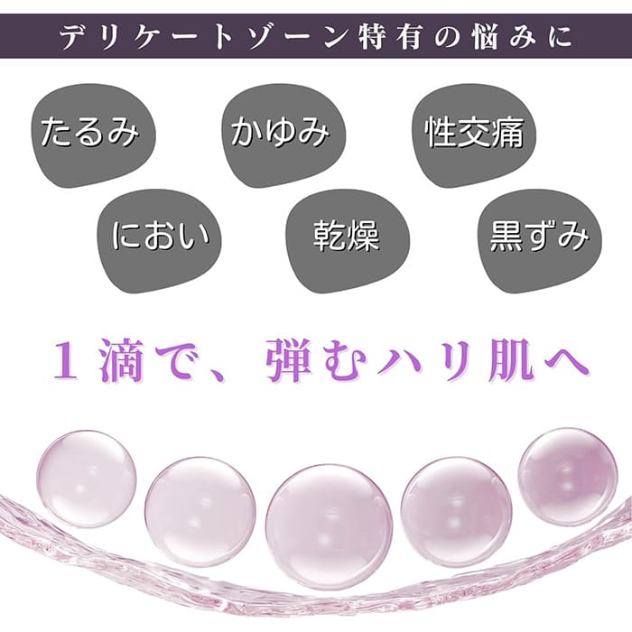 ハリ・潤い、透明感、消臭・香りにアプローチし、デリケートゾーン特有のたるみやにおい、黒ずみなどのケアを1本で行ってくれます。