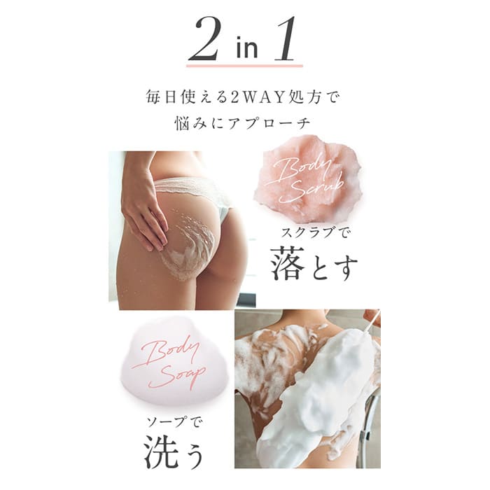 温泉にも含まれる成分の3種のスクラブ(硫酸ナトリウム、炭酸水素ナトリウム、炭酸ナトリウム)により、固くなった古い角質を優しく除去します。